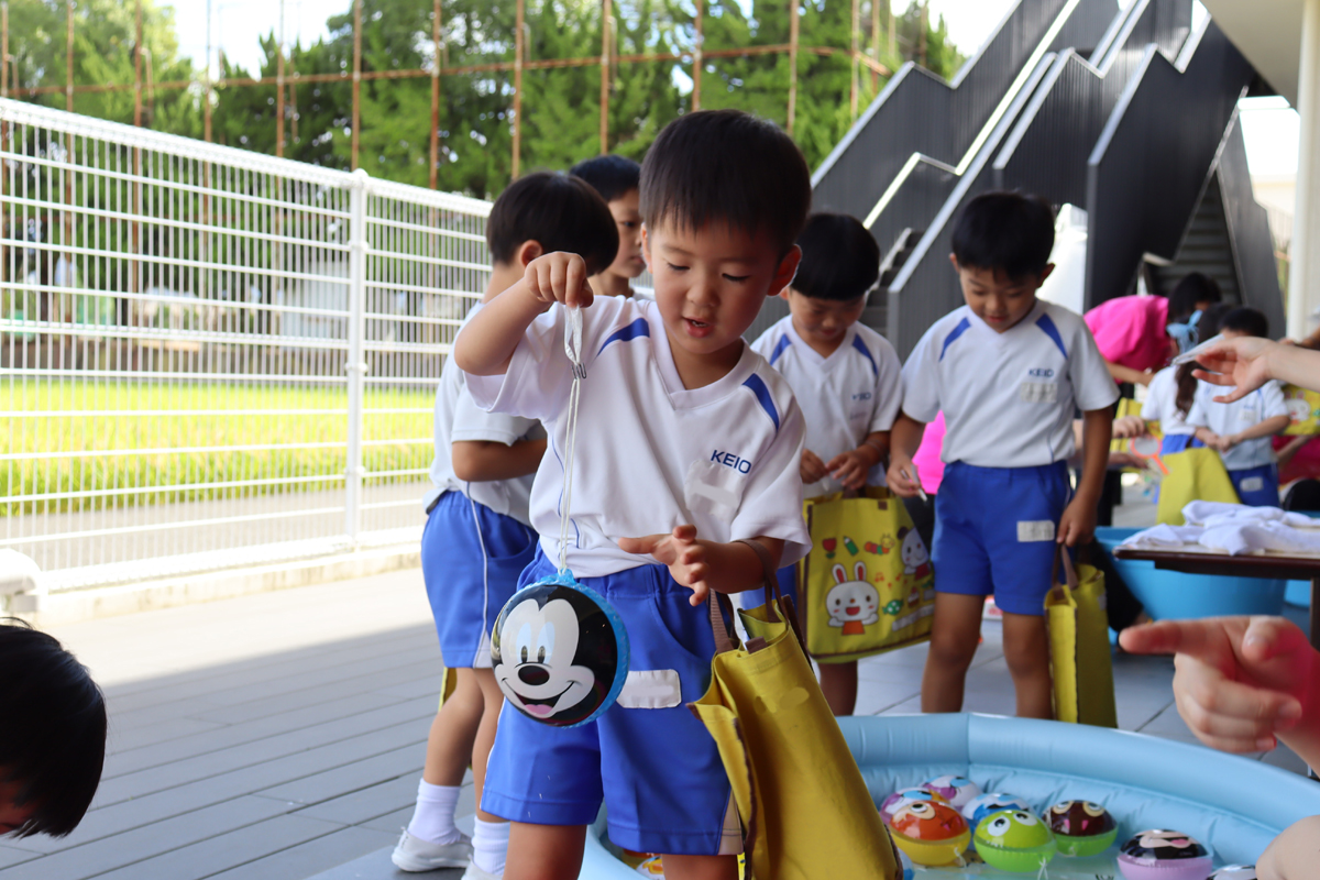 お祭りごっこに続いて、屋外で水遊びをしました。