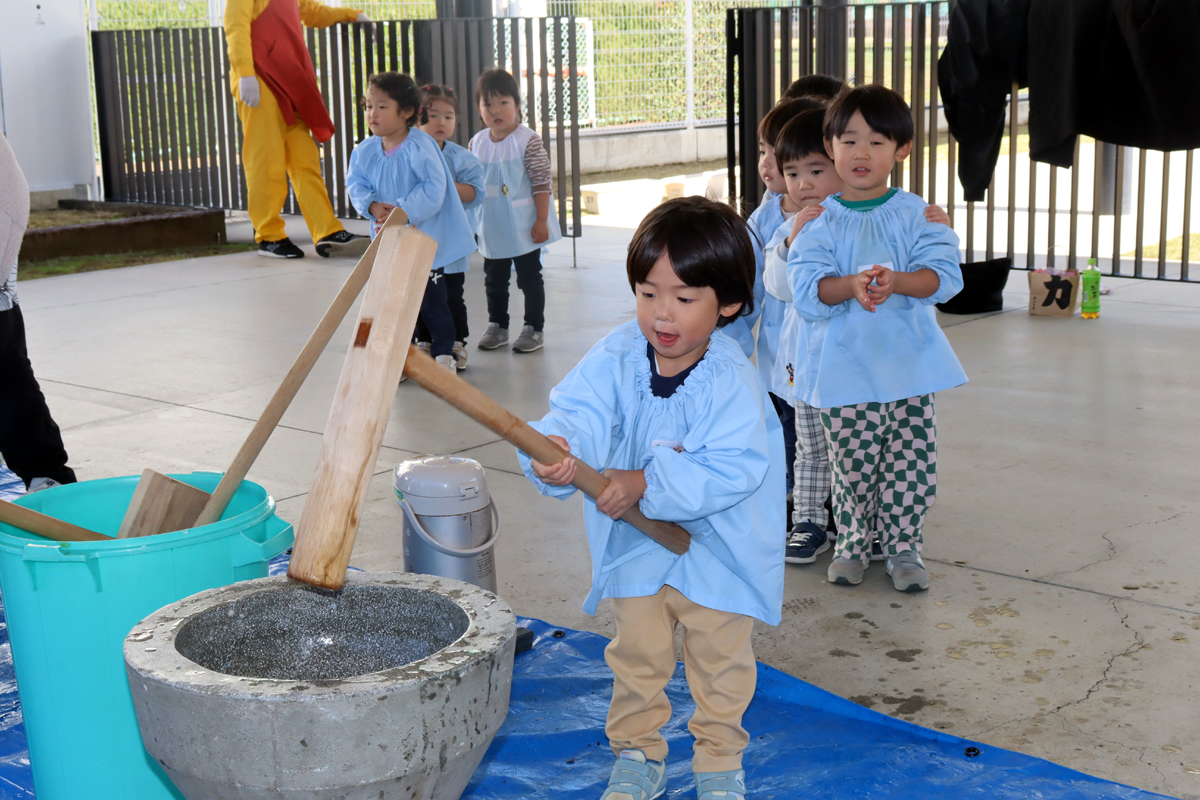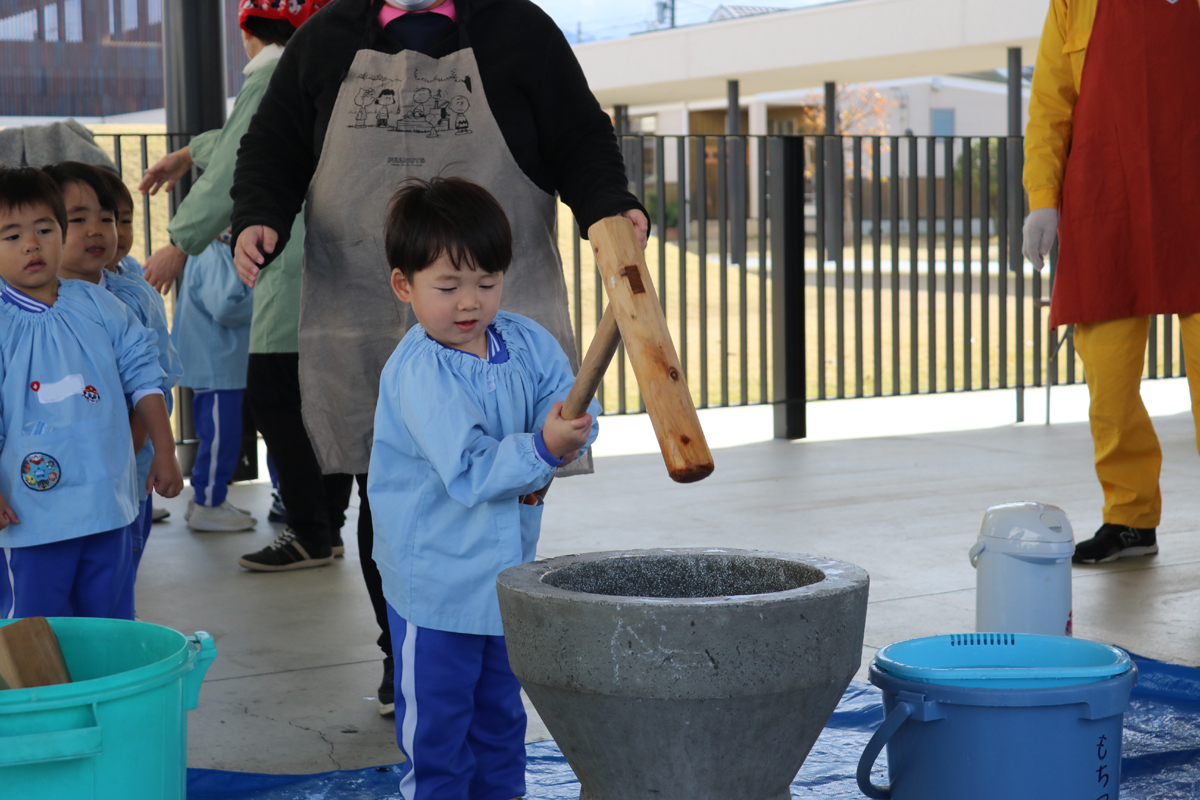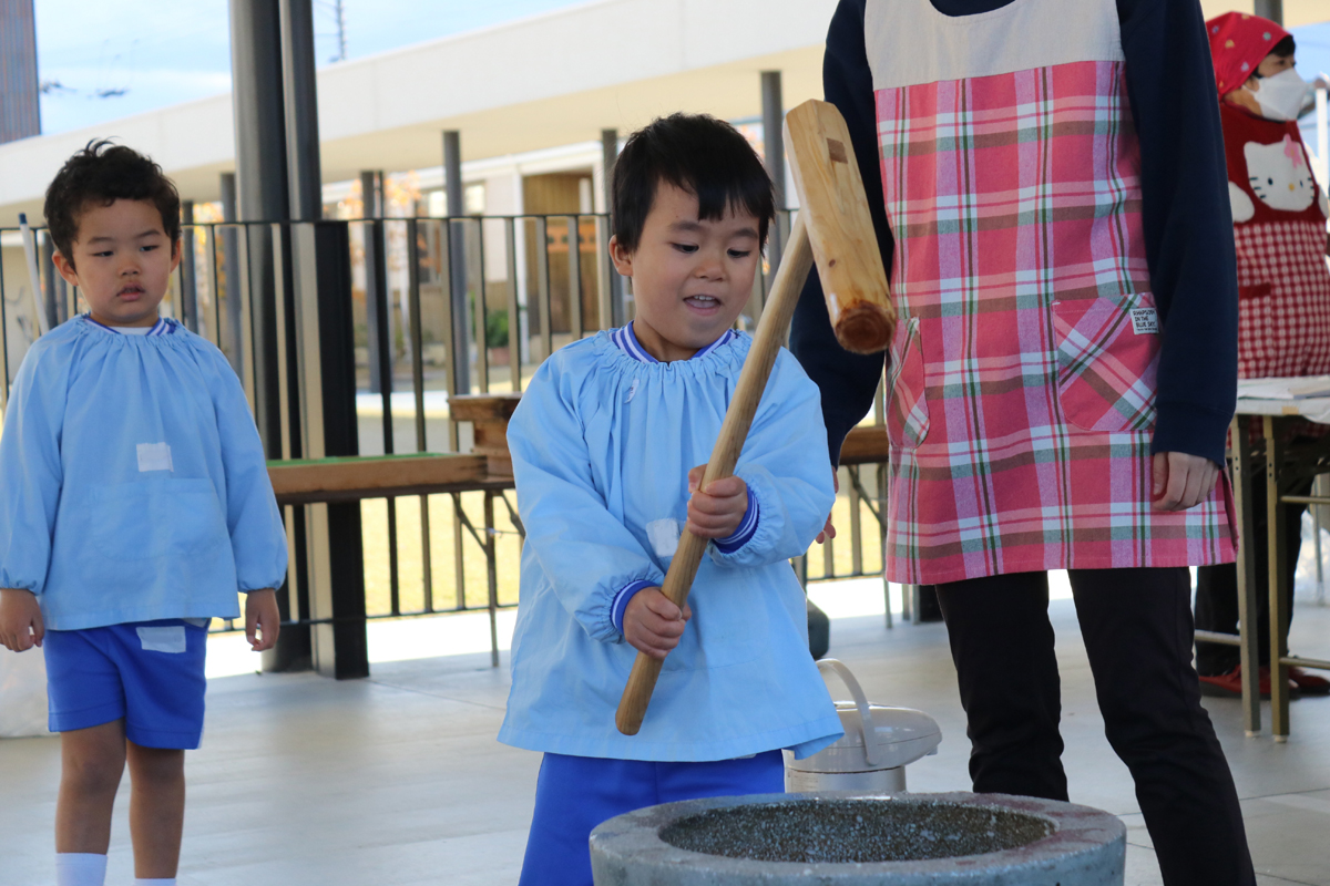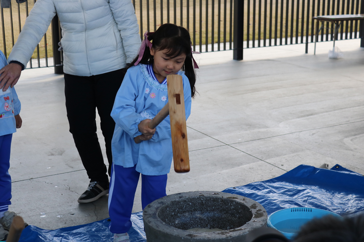 年長児からプレ年少の幼児まで杵をもって、実際にもちつきをしました。