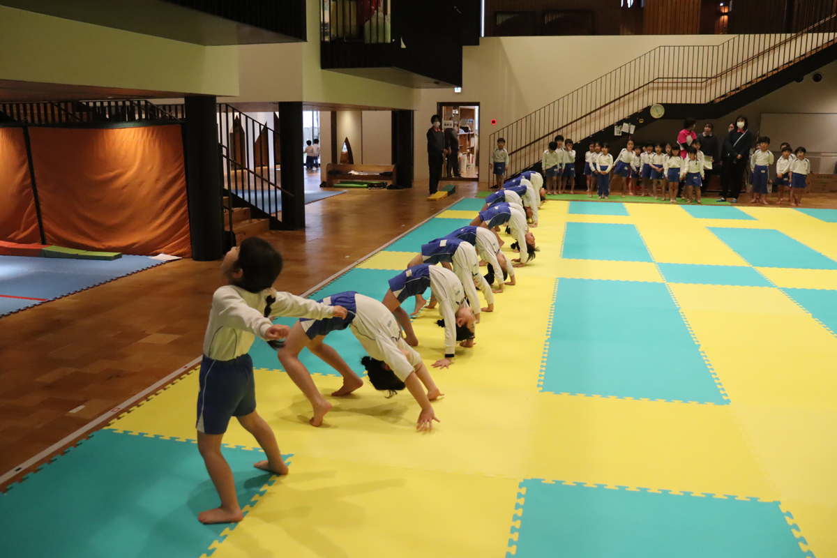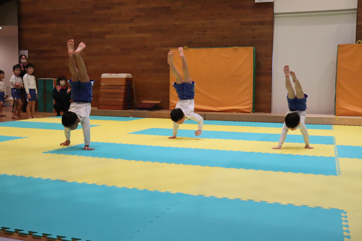 年長児は、逆立ち歩き、前回転など、難しい技にも挑戦しています。