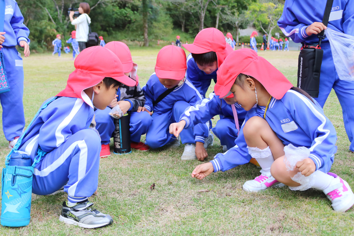 バッタを捕まえたり、木の実を探したり、追いかけっこをしたりして過ごしました。