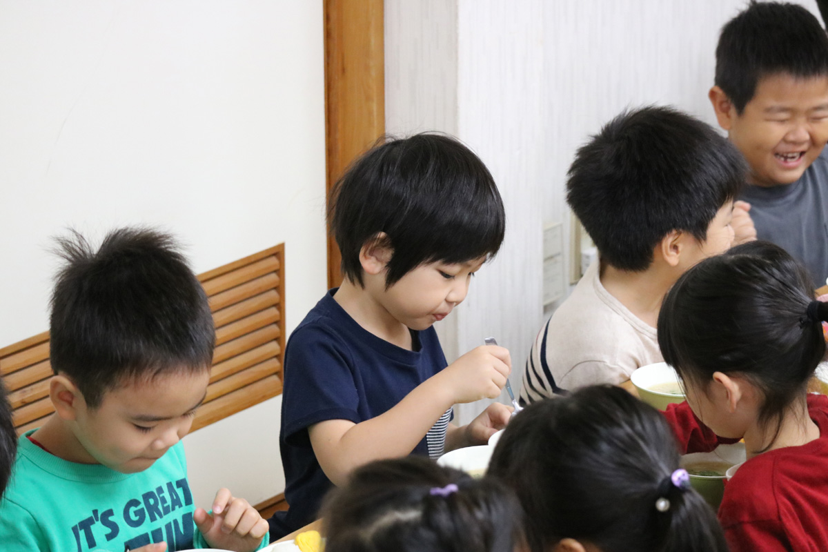 「いただきます」のあいさつを終えると、ものすごいスピードで食べる幼児たち。