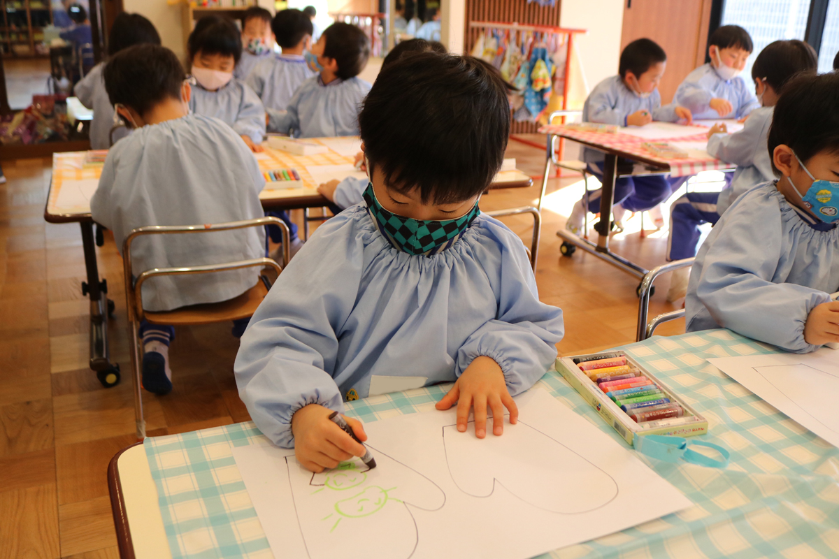 画用紙に印刷してある手袋にクレヨンで好きな柄を描いていきました。